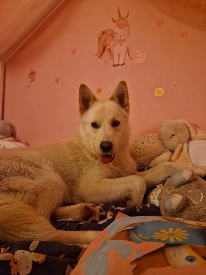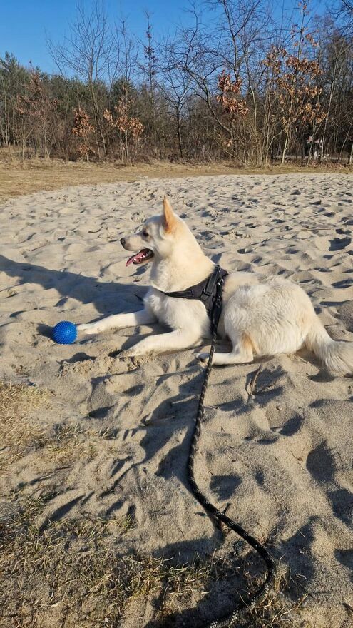 HAPPY ma około 8-10 miesięcy waży około 20 kg to mieszaniec z białym husky także pies pracujący.